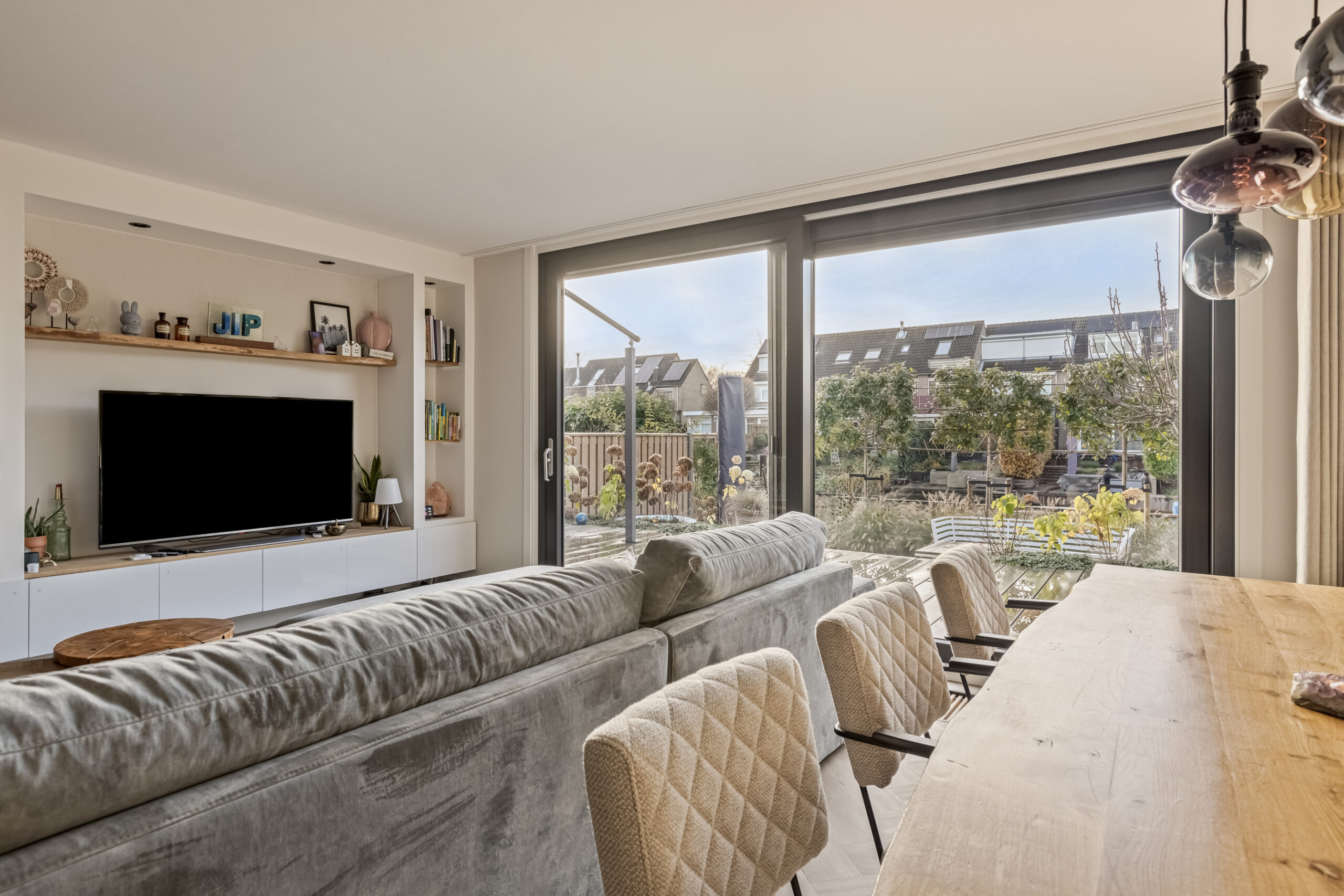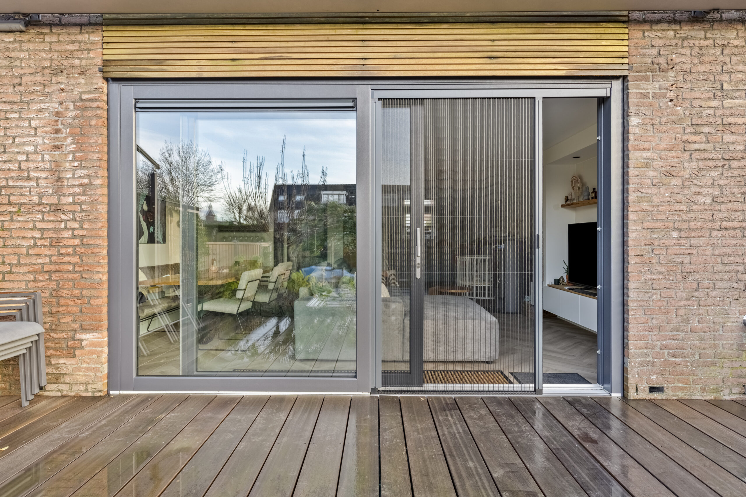 Vanuit het midden kunt u de schuifpui helemaal openen naar 2 kanten.